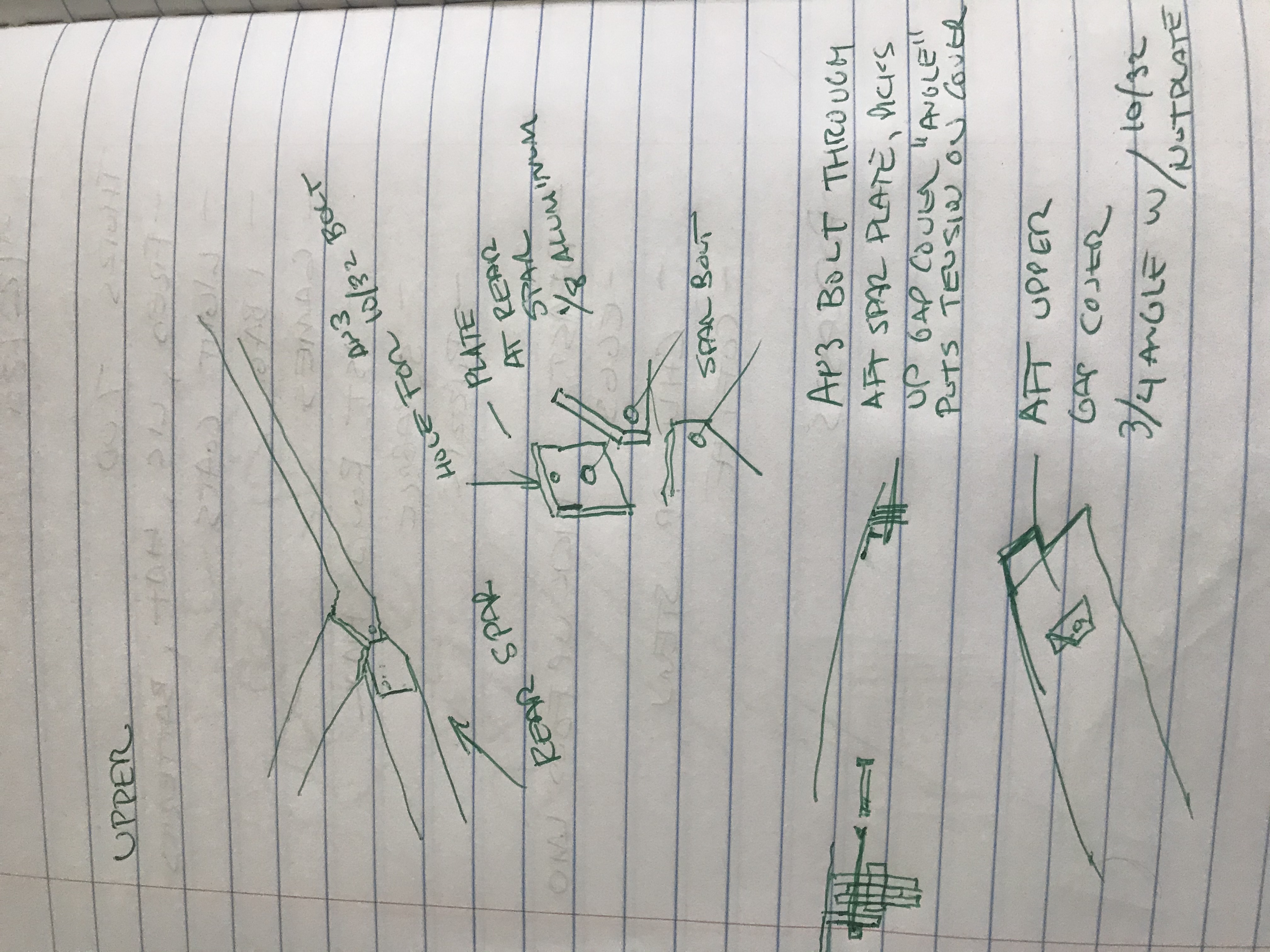 Upper attach, the gap cover gets a piece of 3/4 angle riveted on the aft rear such that it falls about 3/4 from the rear spar. This angle should have a 10/32 nut-plate facing aft. At the rear spar a piece of 3/32 - 1/8 aluminum is fabricated such that the rear spar now consists of the each of the outer and inner spar attach and this plate. The rear spar bolt captures the new plate. The plate has a hole drilled for an AN3 bolt to pass just above the center of the rear spar plates.